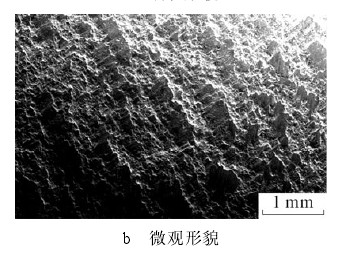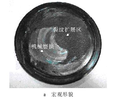 2.1.1 軸斷裂面宏觀及微觀形貌觀察 軸斷裂面處于軸上軸承安裝處的過渡圓弧區(qū)域(軸承安裝根部)。圖 1 為斷軸宏觀斷裂面,局部發(fā)生磨損,斷口表面齊整與軸向垂直,無縮頸和塑性變形痕徑。斷口疲勞條帶明顯,從外圓向中心擴(kuò)展,最終瞬斷區(qū)面積小于軸截面積的 10%,說明斷軸所受名義應(yīng)力較小。