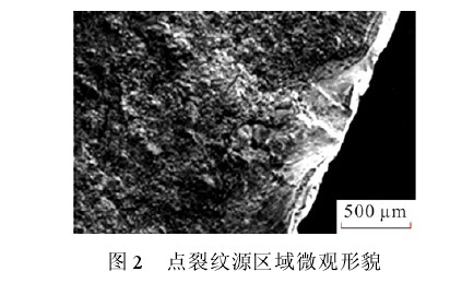 通過電鏡掃描微觀觀察,斷裂源起源于軸頸堆焊層表面,呈多源分布特征,有點(diǎn)裂紋源和線性裂紋源2.1.2 電機(jī)軸材質(zhì)分析 對(duì)基體進(jìn)行光譜元素測量,分析結(jié)果示于表 1。分析結(jié)果表明,軸材質(zhì)元素成分分布均勻,無其他缺陷,僅含有少量硫化物、氧化物等冶金缺陷,屬于中碳鋼,對(duì)應(yīng)我國 45#鋼,是電機(jī)軸常用推薦材料,分析認(rèn)為軸材質(zhì)合格,并未對(duì)軸斷裂造成影響。
