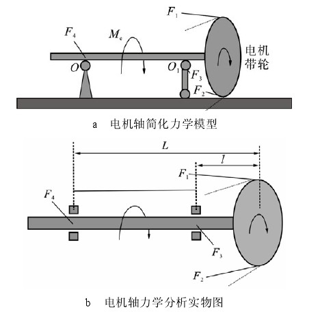 2.2 電機(jī)軸力學(xué)計(jì)算分析由于電機(jī)軸為階梯軸,不同階梯截面處承受的力矩和應(yīng)力是不同的。電機(jī)運(yùn)行時(shí)軸受到彎扭力矩的共同作用,如果某一階梯截面承受應(yīng)力過大,則可能最先在階梯截面過渡圓弧處萌發(fā)裂紋和發(fā)生斷裂,因此找出電機(jī)軸受力危險(xiǎn)截面,對(duì)判斷軸斷裂原因有重要作用。電機(jī)軸力學(xué)分析簡化模型如圖 4 所示。圖中,F(xiàn)1、F2為皮帶張緊力;F3、F4為電機(jī)軸支撐力;Me為電機(jī)轉(zhuǎn)矩;O 與O1為電機(jī)軸支撐點(diǎn);F 為皮帶張緊力 F1與 F2的合力;T 為 O1支撐點(diǎn)承受的彎矩;D 為電機(jī)軸分析截面直徑;M 為分析截面對(duì)應(yīng)扭矩;L 和 l 分別為電機(jī)左端軸承距右端軸承及電機(jī)帶輪的水平距離。